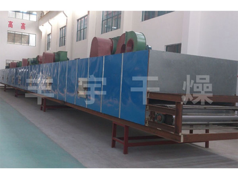物料由加料器均勻地鋪在網帶上,網帶一般采用12-60目不銹鋼絲網,由傳動裝置拖動在干燥機內移動。干燥機由若干單元組成,每一單元熱風獨立循環(huán),部分尾氣由專門排濕風機排出,廢氣由調節(jié)閥控制,熱氣由下往上或由上往下穿過鋪滿物料的網帶完成熱量與質量傳遞的進程,帶走物料水份。網帶緩慢移動,運行速度可根據物料溫度自由調節(jié),干燥后的成品連續(xù)落入收料器中。上下循環(huán)單元根據用戶需要可靈活配備,單元數量亦可根據需要選取。