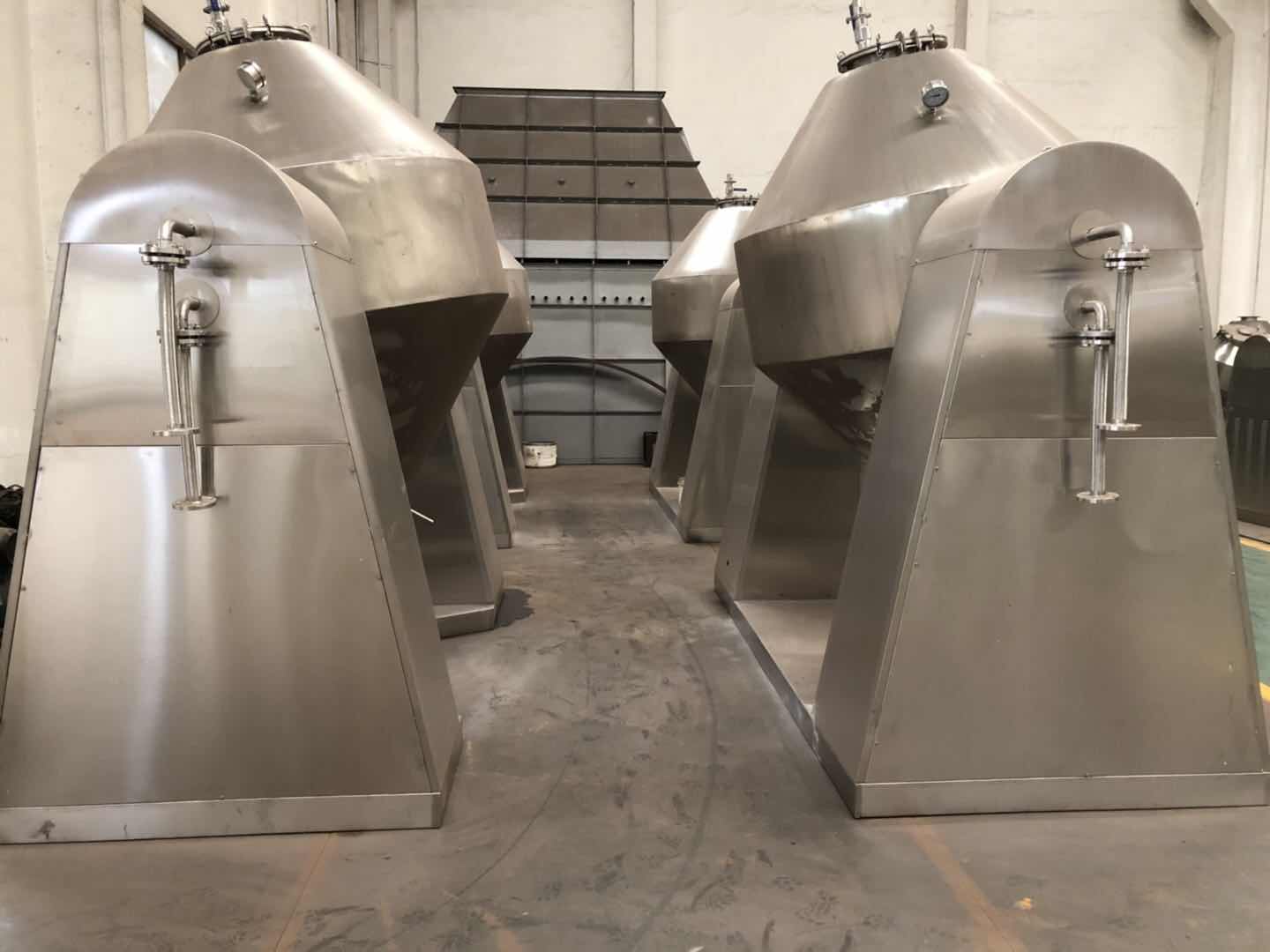雙錐回轉真空干燥機為雙錐形回轉罐體,設備中間為圓柱形,兩端為圓錐形,圓錐頂部一頭設計為敞開式投料(兼做人孔),另一端為蝶閥出料。罐體內(nèi)、外共分三層,中間夾套加熱介質可以是蒸汽、循環(huán)熱水或導熱油,保溫層為中堿超細玻璃棉,耗能極少;內(nèi)層投放物料。工作時罐內(nèi)處在真空狀態(tài)下,向夾套內(nèi)通入導熱油、熱水或蒸汽等熱媒進行加熱,熱量通過罐體內(nèi)壁傳遞給濕物料。